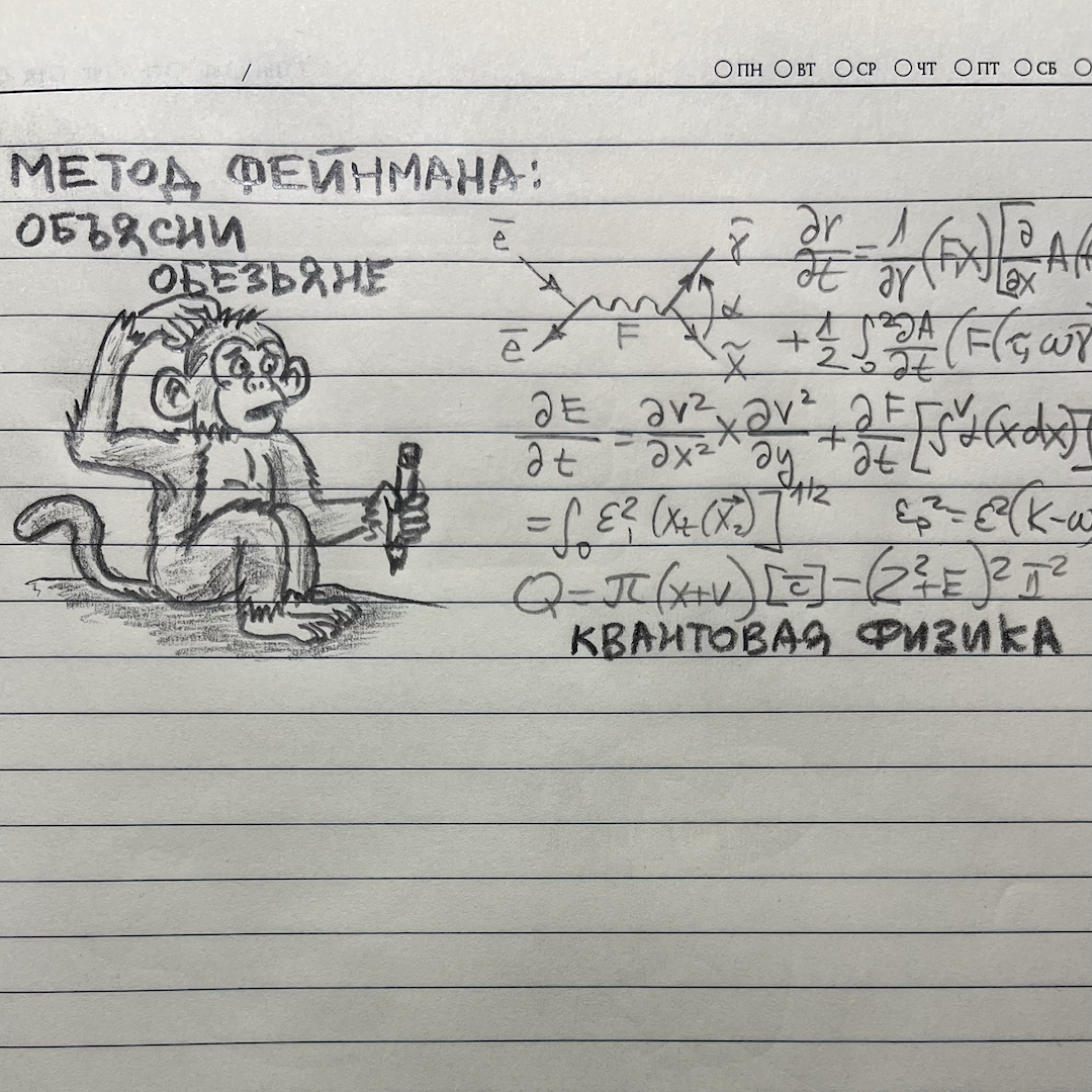 Весь март я внедряю десяток другой привычек. Бью в одну точку, чтобы перепрошить дисциплину. Вчера я был «выжат как лимон». Несколько ночей бессонницы превращают день в выживание. Сегодня я спал нормально и хочу разобрать, почему «Полноценный сон» это одна из ключевых привычка в моем списке. Почитал в интернете и нашел, что метод который я использую, называется метод Фейнмана. В жизни я называю его проще: «объясни так, чтобы поняла даже обезьяна». (Тут важный нюанс: когда я говорю это при людях, некоторые обижаются. Зря. Это не сравнение с обезьяной. Это не про интеллект слушателя. Это проверка для меня самого. Если я не могу упростить материал до уровня простых. и базовых образов, значит я сам плаваю в теме и прикрываюсь сложной терминологией). Ричард Фейнман, нобелевский лауреат, внес вклад в квантовую физику, считал: если ты не можешь объяснить тему простыми словами без заумных терминов, значит, ты сам в ней не разобрался. Пример. Можно заумны
