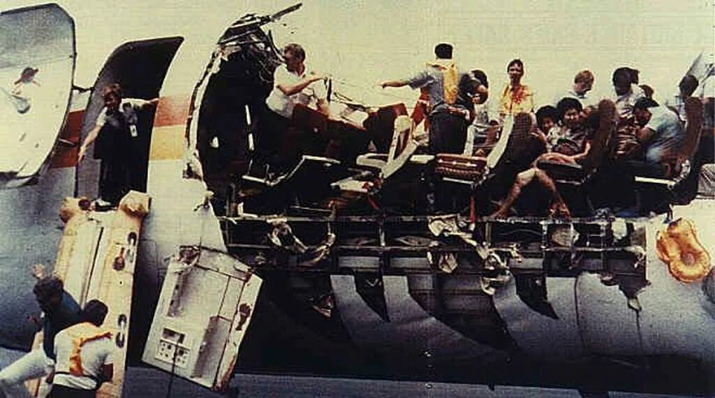 Короче, 1988 год, Гавайи. Летит себе Боинг 737 между островами, рейс на полчаса, рутина полная. И вдруг на высоте семь километров у него просто сносит крышу. Шесть метров фюзеляжа улетели. Люди сидят в креслах, над ними небо, ветер в лицо с такой силой, что щёки к ушам прибивает. Стюардесса Кларабель собирала стаканчики в проходе. Её вынесло за борт моментально. Даже понять ничего не успела. В салоне ад. Кислородные маски мотыляются, орать невозможно, воздух из лёгких вышибает. Вторая стюардесса Мишель ползёт по проходу, у самой голова разбита, кровь хлещет, она не замечает, прижимает людей к креслам, чтоб не унесло. Пилот оборачивается и видит небо там, где должен быть салон. Надо как-то сажать. И вот он 13 минут ведёт эту консервную банку на посадку. Орёт в рацию, его не слышно из-за ветра. Лететь надо медленно, иначе обшивку дорвёт до конца, но слишком медленно нельзя, упадёшь. Каждую секунду непонятно, долетит или развалится. Долетел. Сел. Шасси вышло, тормоза сработали, все дела.