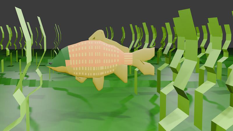 Трехмерная сцена на сегодня по мотивам рыбы Карп. И зарослей подводных где рыба плавает. Тут светло. Сверху проникает солнечный свет. И чешуя рыбы тоже играет серебристым и золотистым цветом. Как же тут красиво. И как интересно смотреть за подводным миром когда солнце поднимается утром и уходит на закате. Мир преображается. Заросли, водоросли. Их много. Высокие стебли тянутся к поверхности. К свету. Там его больше всего. В зарослях тут свой мир. Целый подводный лес. Даже дно все заросло мелкой подводной травкой. Вкусная штука между прочим. Все рыбы здесь едят травку. Которой много. И есть открытые пространства. Равнины под водой. Где ничего нету. Просто поле. Это отличное место для карпа. Вода отличная. Карп тут уже много плавает. И не нашел где тут берег. Это должно быть озеро. С разной глубиной. И оно большое. Это карп понимает. Это его дом. Он здесь живет. В любой момент он может подплыть к дверке подводной и она ведет в другой мир. Там живет другая рыба. Все они друзья. У каждого с