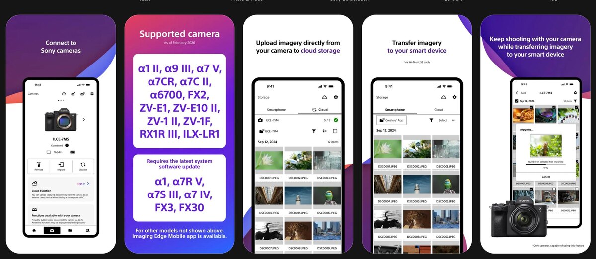 Обновление сфокусировано на автоматизации работы с отснятым материалом и более тесной интеграции с платформой Creators' Cloud. Главные нововведения версии 3.3: Массовая загрузка неотправленных файлов. Теперь пользователи могут пакетно загружать в облачное хранилище Creators' Cloud сразу все фотографии и видео, которые еще не были перенесены с камеры или смартфона. Гибкие критерии фильтрации. Появилась возможность задавать точные правила для автозагрузки. Например, вы можете настроить приложение так, чтобы оно выгружало файлы только определенного формата, или передавало исключительно те кадры, которым вы поставили оценку (звезды рейтинга) прямо на экране камеры во время съемки. Приложение остается основным инструментом для беспроводного управления и передачи данных на всей современной линейке камер Sony. PS Creators' App превосходит старое приложение Imaging Edge за счет того, что позволяет продолжать съемку прямо во время передачи файлов на телефон, а также умеет автоматически воз