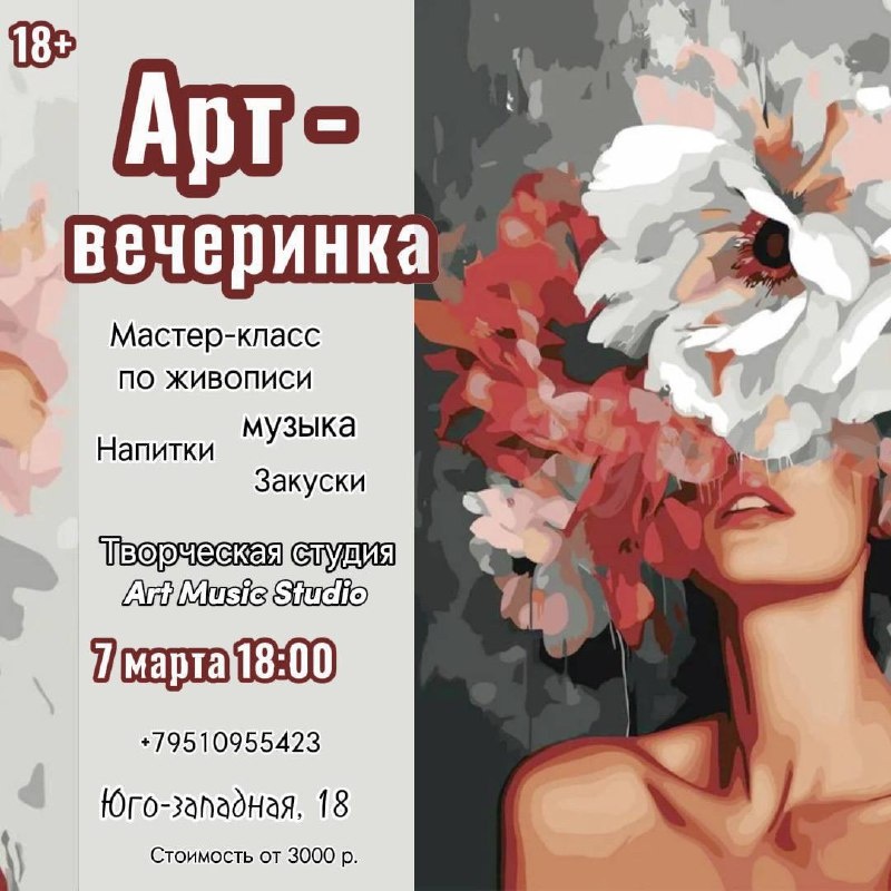 + 🗓️ 7 марта в 18:00 📍 Юго-западная , 18 В программе: - м/к живопись (любая картина на выбор) - фуршет - атмосфера: музыка, свечи и др. Продолжительность: 3-3,5 часа 🏷️ 3000₽* *Скидка для подруг (от 2х человек) - 10% Запись у @Alenatarasova92 #7марта26@culturnik