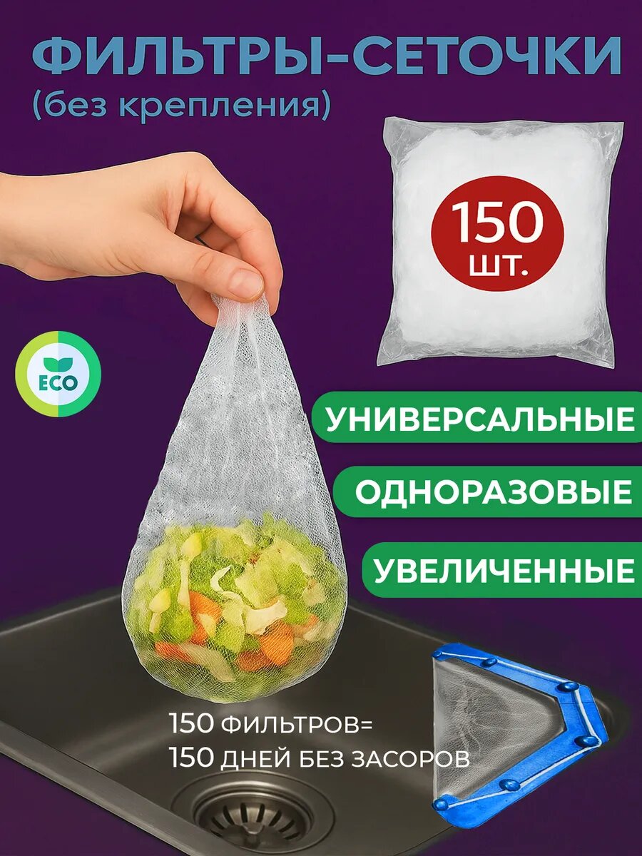 Универсальные увеличенные одноразовые фильтры-сетки для защиты раковины и ванны от засоров. В комплекте 150 штук — хватает надолго, при этом цена дешевле, чем у многих. Каждый мешочек надёжно задерживает мусор и остатки пищи, предотвращая их попадание в трубы.