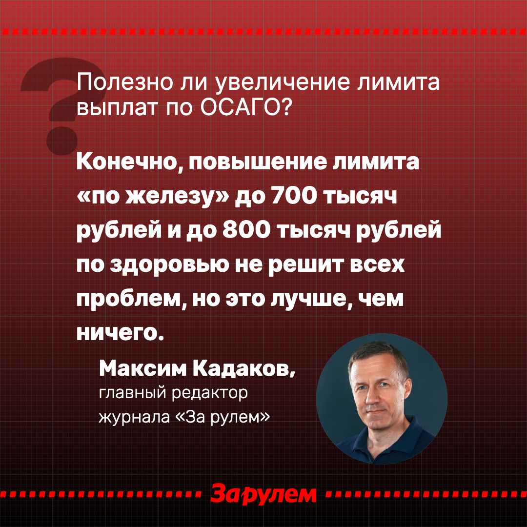 Главный редактор «За рулем» Максим Кадаков оценил перспективу такого нововведения: «Конечно, повышение лимита «по железу» до 700 тысяч рублей и до 800 тысяч рублей по здоровью не решит всех проблем, но это лучше, чем ничего. Как отмечают сами депутаты, с 2014 по 2024 год средняя стоимость полиса ОСАГО выросла с 1,8 тысячи рублей до 7,5 тысячи рублей (+284%), в то время как максимальный размер страховых выплат остается неизменным».