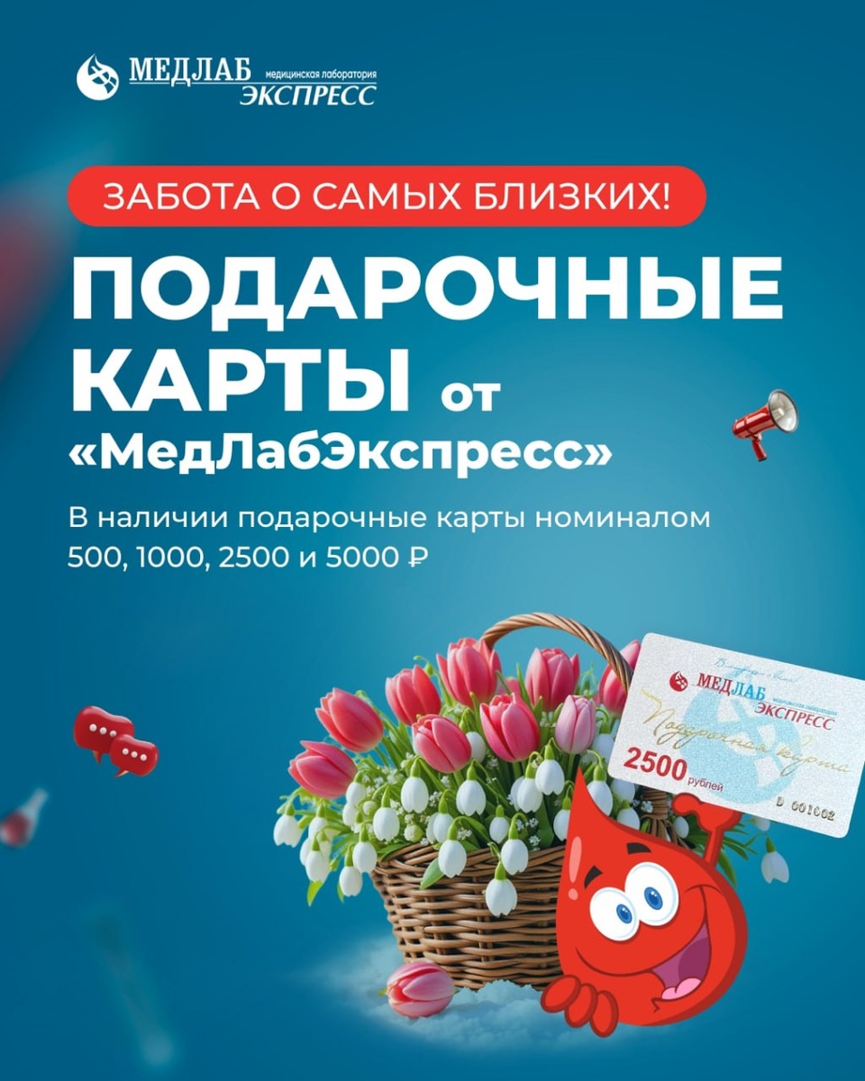 Когда женщина чувствует себя здоровой и энергичной, она может дарить тепло и заботу родным, создавать уют и счастье в доме. Забота о себе – это не просто красивый жест, а необходимое условие для того, чтобы быть женственной и вдохновлять других. В лаборатории «МедЛабЭкспресс» есть подарочные карты номиналом от 500 рублей. Это возможность узнать состояние своего организма или сдать нужные анализы. 🌼 Как приобрести подарочный сертификат? Можно в любом удобном заборном пункте лаборатории. Выберите необходимый номинал и оплатите у регистратора подарочную карту. 🌼 Как воспользоваться сертификатом? При сдаче анализов скажите регистратору, что у вас есть подарочная карта. При оформлении заказа подарочные рубли автоматически спишутся в счет оплаты. Если сумма заказа будет меньше, разница останется на будущие заказы. Если больше — вам нужно будет доплатить разницу. Берегите себя, заботьтесь о своем здоровье и своих близких 💙