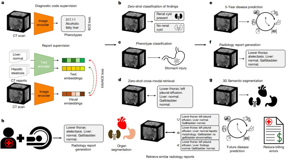 В свежем номере Nature опубликована работа команды Стэнфорда о модели Merlin — первом в своём классе 3D визуально‑языковом (3D VLM) решении, которое нативно обрабатывает объёмные медицинские исследования (CT) и обучается без дорогостоящей ручной разметки. Результаты обещают не просто инструмент помощи радиологам, а изменение парадигмы: автоматизация рутины, ранняя детекция биомаркеров и масштабируемая аналитика рисков пациентов. Статья Nature с подробностями исследования: Nature article Что такое Merlin и чем он отличается В обучающем корпусе: 15 331 исследований CT, более 6 млн изображений (срезов), ~1.8 млн диагностических кодов и ~6 млн текстовых токенов/меток из отчётов. Такой объём «естественных» клинических сигналов позволил модели выучить сопоставления между 3D‑структурами и клиническими понятиями без ручной разметки. Merlin проверяли по 6 большим задачам и 752 подзадачам. В zero‑shot классификации модель распознавала 30 распространённых абдоминальных находок (внутренний F1 = 0.