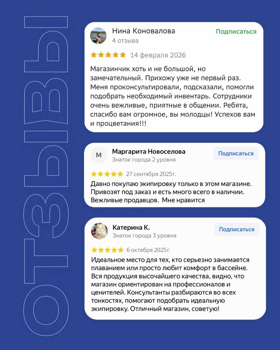 🩵 Лучшая награда для нас — ваши улыбки и отзывы 😇 Благодарим за то, что находите время и делитесь впечатлениями о визите к нам в магазин. Мы всегда прислушиваемся к вашим пожеланиям и меняемся в лучшую сторону. Отставить мнение о BigSwim можете и вы 🌊 Удобнее всего это сделать это по ссылке!
