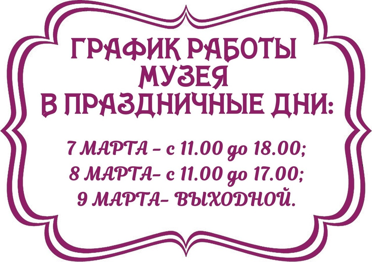 Уважаемые гости музея! ‼Обратите внимание на ГРАФИК РАБОТЫ музея в праздничные дни‼Экскурсии проходят по сеансам. 7 МАРТА - с 11.00 до 18.00. Сеансы экскурсий: 11.00, 12.00, 13.00, 14.00, 15.00, 16.00, 17.00; 8 МАРТА- с 11.00 до 17.00. Сеансы экскурсий: 11.00, 12.00, 13.00, 14.00, 15.00, 16.00; 9 МАРТА- ВЫХОДНОЙ. Ждём вас! Присылайте ваши новости в сообщения нашего канала Мы в Max, вступайте Источник: Открыть