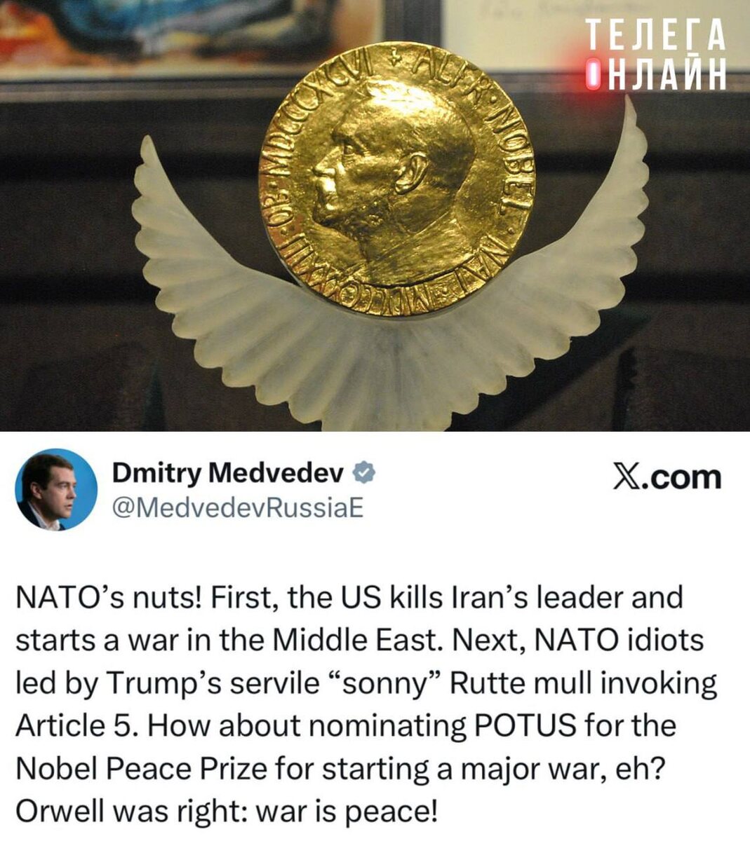Зампред Совбеза Медведев не устает восхищаться «миропорядком, основанным на правилах»: НАТО — это безумие! Сначала США убивают лидера Ирана и развязывают войну на Ближнем Востоке. Затем идиоты из НАТО во главе с раболепным «сынком» Трампа Рютте начинают обсуждать применение статьи 5. Как насчет того, чтобы номинировать президента на Нобелевскую премию мира за развязывание крупной войны? Оруэлл был прав: война — это мир! Уже, Дмитрий Анатольевич, уже работают над номинацией. 🚲 Подпишись на Телега Online в MAX