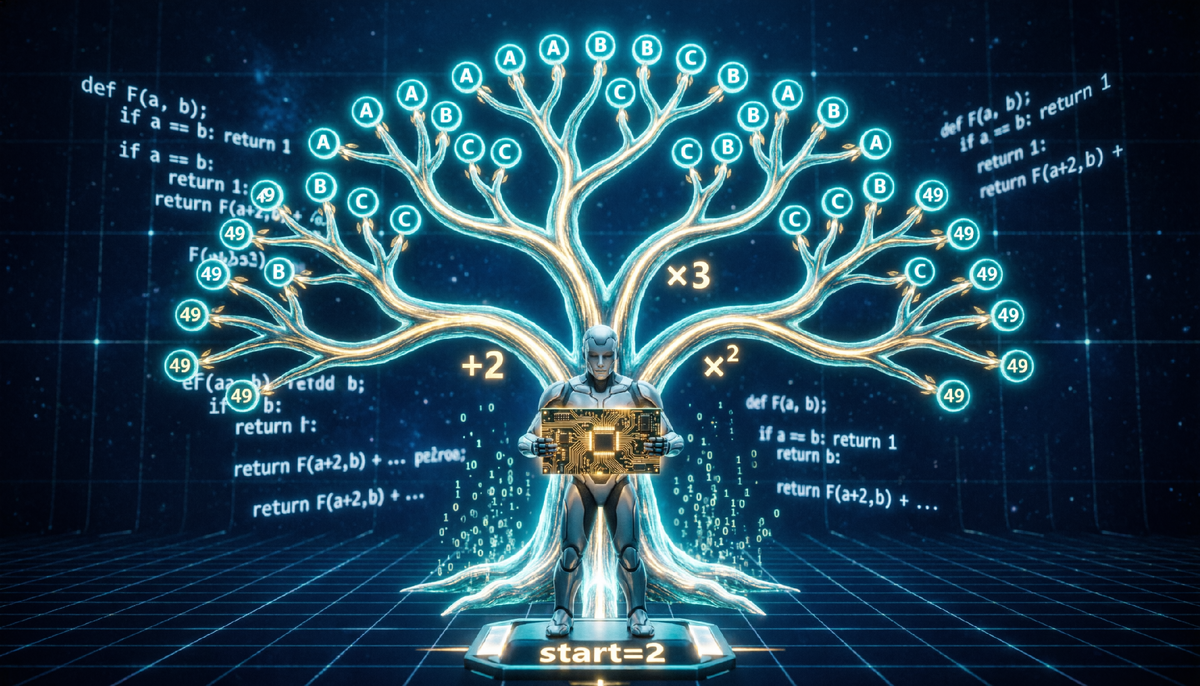 Именно так устроены задания, в которых речь идёт о последовательностях операций: прибавить, умножить, возвести в степень… Каждый выбор ведёт к новой ветке вычислений, и чтобы найти количество корректных программ, нужно обойти всё дерево возможностей.