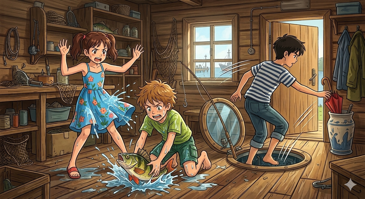 Игорь стоял возле деревянного люка с удочкой, на которой болталась большая рыба. Боря пытался поймать рыбу, но она извивалась, и от нее во все стороны летели брызги. Оля завизжала: