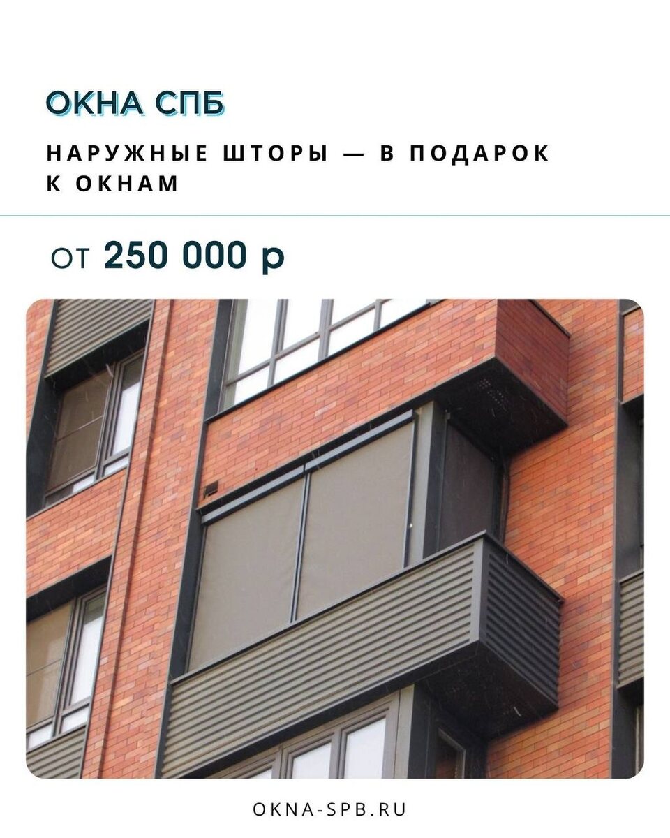 Только сейчас при заказе пластиковых окон на сумму от 250 000 рублей в компании «ОКНА СПБ» к остеклению можно получить комплект наружных штор. Наружные шторы делают использование окон в вашем доме более удобным. 1. Экономия. Полезное решение для дома входит в комплектацию без дополнительной стоимости. 2. Комфорт. Шторы уменьшают нагрев помещения в солнечную погоду и помогают поддерживать более стабильную температуру внутри. 3. Приватность. Конструкция закрывает обзор с улицы, сохраняя при этом естественное освещение. 4. Эстетика. Наружные шторы аккуратно дополняют архитектуру дома и делают фасад более завершённым. Если вы планируете замену или установку окон, рассмотрите этот вариант как один из своих решений: система остекления и наружная защита от солнца будут работать как единое решение. Подробности можно уточнить у наших менеджеров: 📞 Окна СПБ +7 (812) 602-50-72 +7 (812) 670-07-67 Подробнее об акции на нашем сайте: Окна СПб