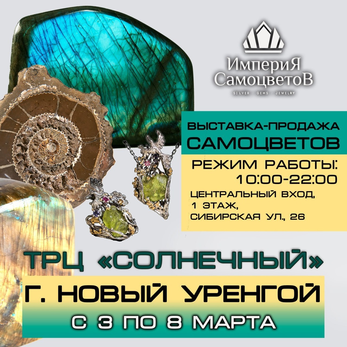 ». Украшения с натуральными камнями - это не просто подарок, это талисман, который оберегает своего владельца. Чароит, бирюза, топаз, агат, малахит, опал, янтарь. Яркие и блестящие камни притягивают взгляды, а их уникальные свойства не оставят равнодушными даже самых капризных покупателей. Украшения представлены на любой вкус и кошелек. Кулоны, бусы, серьги, кольца, браслеты, чокеры с уникальной геометрией. Для ценителей особенных вещей: срезы камней, шкатулки, шары с природными узорами, фигурки и полезные сувениры. 📍 Где: г. НОВЫЙ УРЕНГОЙ, ТРЦ "СОЛНЕЧНЫЙ», 1 этаж Центральный вход. 📅 Когда: с 3 по 8 марта
