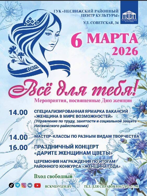 👈 ✔️ Несвижский РЦК приглашает на праздничное мероприятие, посвящённое дню женщин, «Всё для тебя!» 📌 В программе: 🔹 14.00 — ярмарка вакансий «Женщина в мире возможностей» (управление по труду, занятости и социальной защите несвижского райисполкома) 🔹 14.00 — творческие мастер-классы (можно попробовать себя в новых видах искусства) 🔹 16.00 — праздничный концерт «Дарите женщинам цветы» (церемония награждения «женщина года») 6 МАРТА Несвижский РЦК (ул. Советская, д. 34) Вход свободный