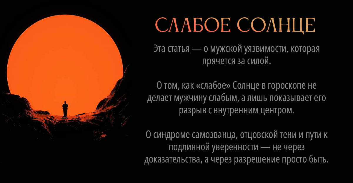Мужчинам не нравится слово «слабость». Но в астрологии слабое Солнце — не про отсутствие силы. Это про отсутствие внутреннего центра. Солнце — это не харизма, не лидерство, не громкий голос.