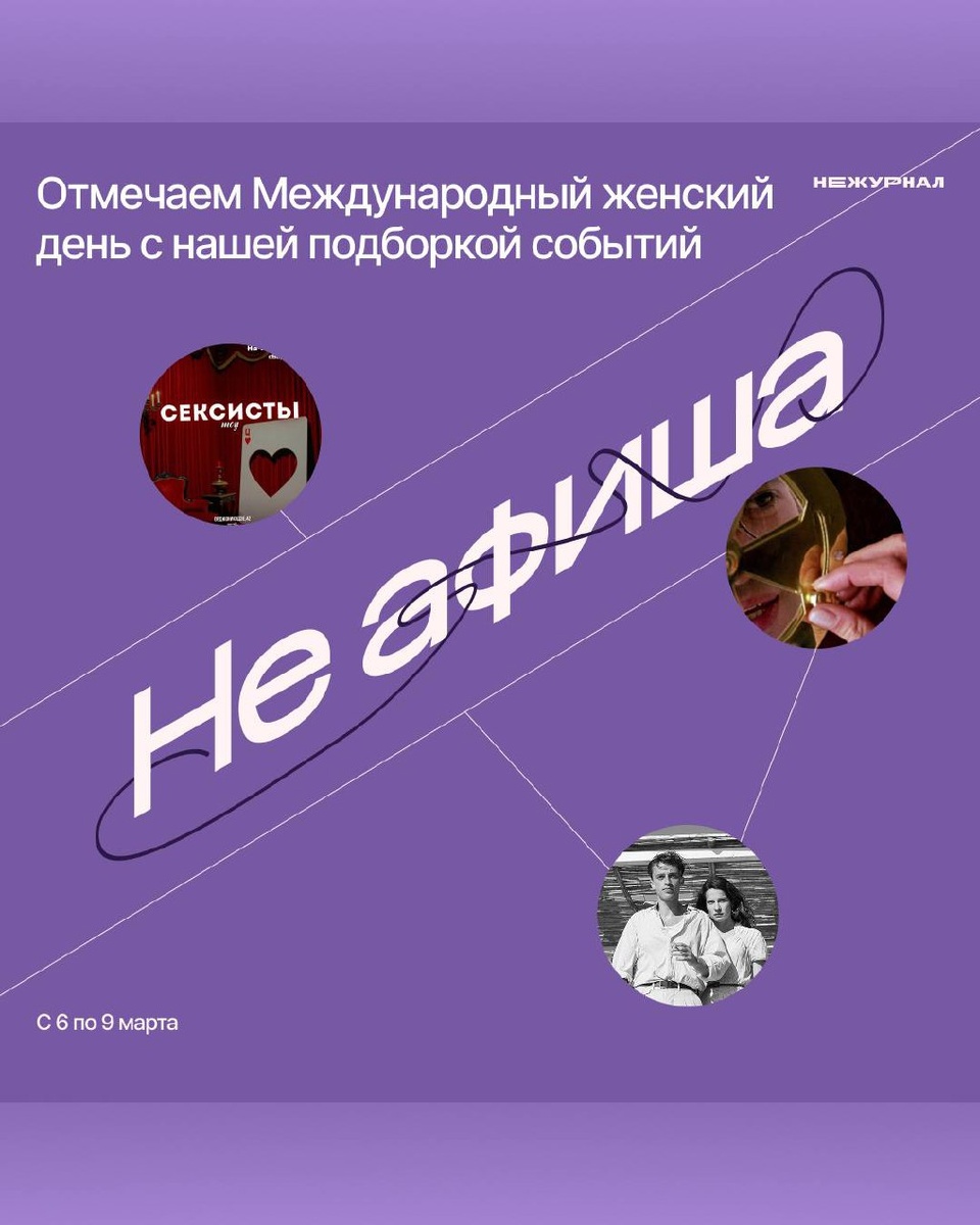 ! • Посторонний (спец.показ) • Выходные в «Своём» • Дарите девушкам цветы • Стиль, свобода, альмодовар • Ода Женщине • Женщины в анимации • Женщины-виноделы • Сексисты 📰 Подпишись на «Не журнал» | Поддержать донатом