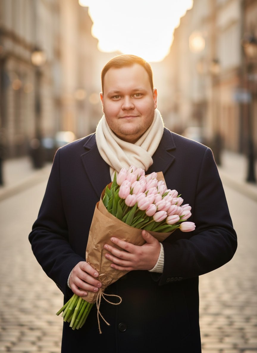 🔥 Хватит слать банальные картинки из интернета. Делаем стиль: твоё лицо, охапка цветов и атмосфера дорогого кино. Закидывай селфи в @SnapToVideo_bot, копируй промпт и выдавай контент, который оценят. Чистый мужской вайб и эстетика. ⚡️ Используя загруженное селфи в качестве точного эталона лица со 100-процентным совпадением (--face_fidelity 1.0), создайте фотографию по описанию, сохранив полное сходство с оригиналом. Кинематографичный [портрет по пояс] стильного мужчины в [классическом тёмно-синем пальто и светлом кашемировом шарфе]. Он [стоит на уютной городской улице в лучах мягкого вечернего солнца], в руках держит [огромный букет нежно-розовых тюльпанов в крафтовой бумаге]. [Тёплое контровое освещение], создающее золотистый контур. [Легкая, искренняя улыбка, прямой взгляд в камеру]. Фотореалистично, высокая детализация кожи, мягкое размытие фона, объектив 85мм, стиль съёмки для модного журнала. Как менять: 👀 🎯 Ракурс (замени [портрет по пояс]): - Вариант 1: [крупный план лица