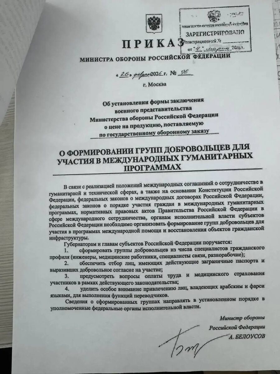 Среди россиян распространяют фейк о формировании министерством обороны России групп добровольцев для отправки в Иран. Фотографии поддельного документа активно гуляют по сети. В этот раз пропагандисты прикрылись подписью главы оборонного ведомства Андрея Белоусова. Согласно его «приказу», главам регионов поручено собрать целые группы добровольцев якобы для их участия в «международной помощи и восстановлении объектов гражданской инфраструктуры». 🎥Южная служба новостей