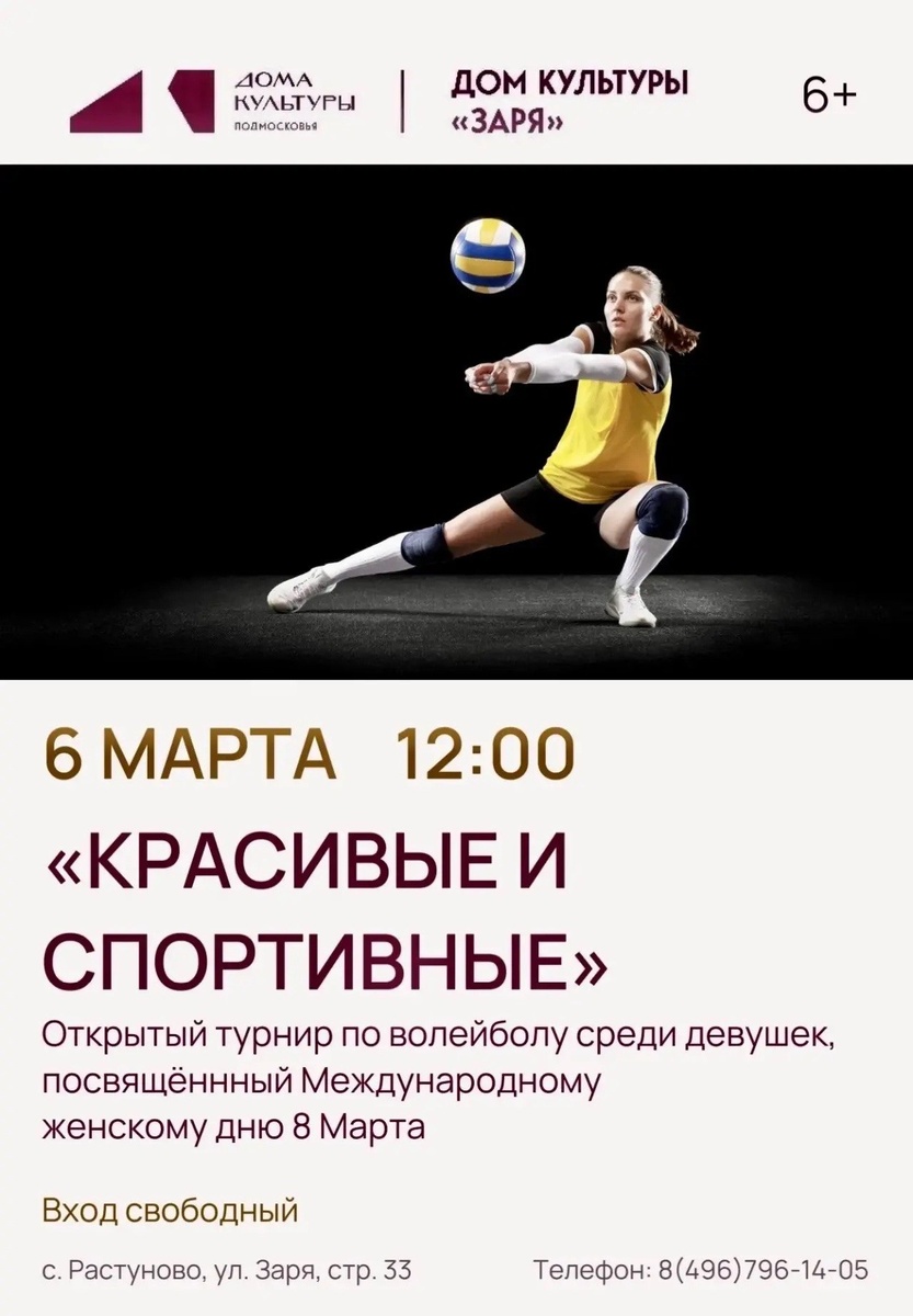 ✨ 🏐 ТУРНИР ПО ВОЛЕЙБОЛУ 🏐 Сельский Дом культуры «Заря» приглашает болельщиков на открытый турнир по волейболу среди девушек «КРАСИВЫЕ И СПОРТИВНЫЕ», посвящённый Международному женскому дню 8 Марта 🚫 Возраст: 6+ 📆 06.03.2026🕒12:00 🏢 Сельский дом культуры (СДК) «Заря» 📍 г.о.Домодедово, с.Растуново, ул.Заря, д.33 ✅ Мероприятия Домодедово https://dzen.ru/id/66f10385cc4c5a16f7b5fb02 https://vk.ru/domodedovo_events http://dzen.ru/domodedovo_events