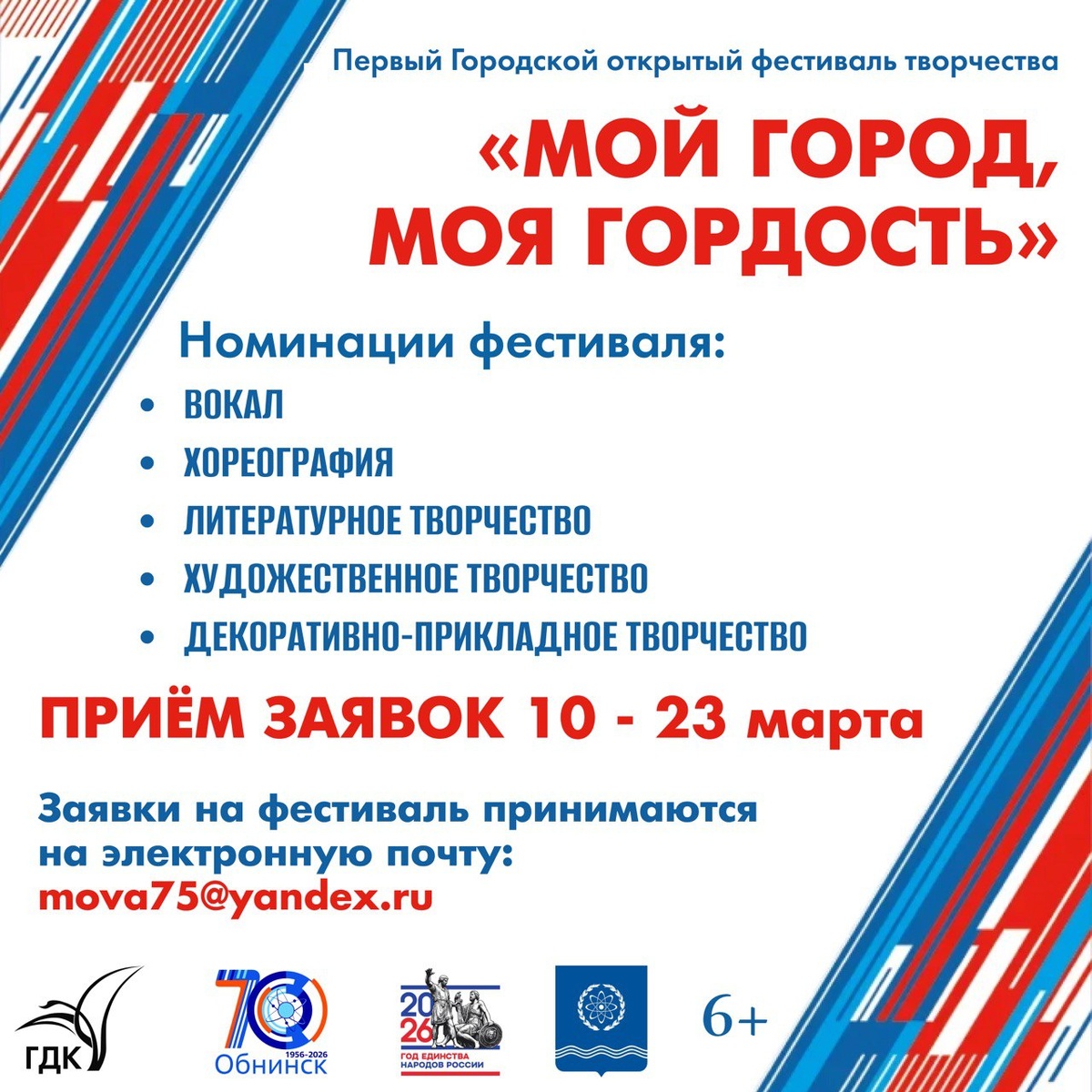 «МОЙ ГОРОД, МОЯ ГОРДОСТЬ» К участию в фестивале посвящённому 70-летию основания города Обнинска, приглашаются жители Наукограда и Калужской области без возрастных ограничений. Для участия в фестивале требуется записать рабочее видео или сделать фото (художественного, декоративно-прикладного творчества) в соответствии с выбранной номинацией, заполнить заявку и отправить на электронную почту с пометкой «Конкурс Мой город — моя гордость» с указанием номинации. mova75@yandex.ru Заявки принимаются до 23 марта 2026 года. 28 марта в 12:00 на сцене Городского Дворца Культуры состоится творческий фестиваль в честь рождения любимого города. Победитель в каждой номинации получает диплом и памятный подарок, все участники фестиваля -диплом участника. Номинации фестиваля: 🎤ВОКАЛ (сольные, групповые номера, посвящённые Обнинску, Калужскому краю, многонациональной стране, празднику - юбилею города); 💃ХОРЕОГРАФИЯ (хореографические постановки, посвящённые Обнинску, Калужскому краю, многонациональ