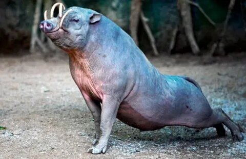 Представьте себе свинью, но с очень длинными ногами и почти безволосым телом, покрытым серо-коричневой, морщинистой кожей. Это и есть бабирусса.