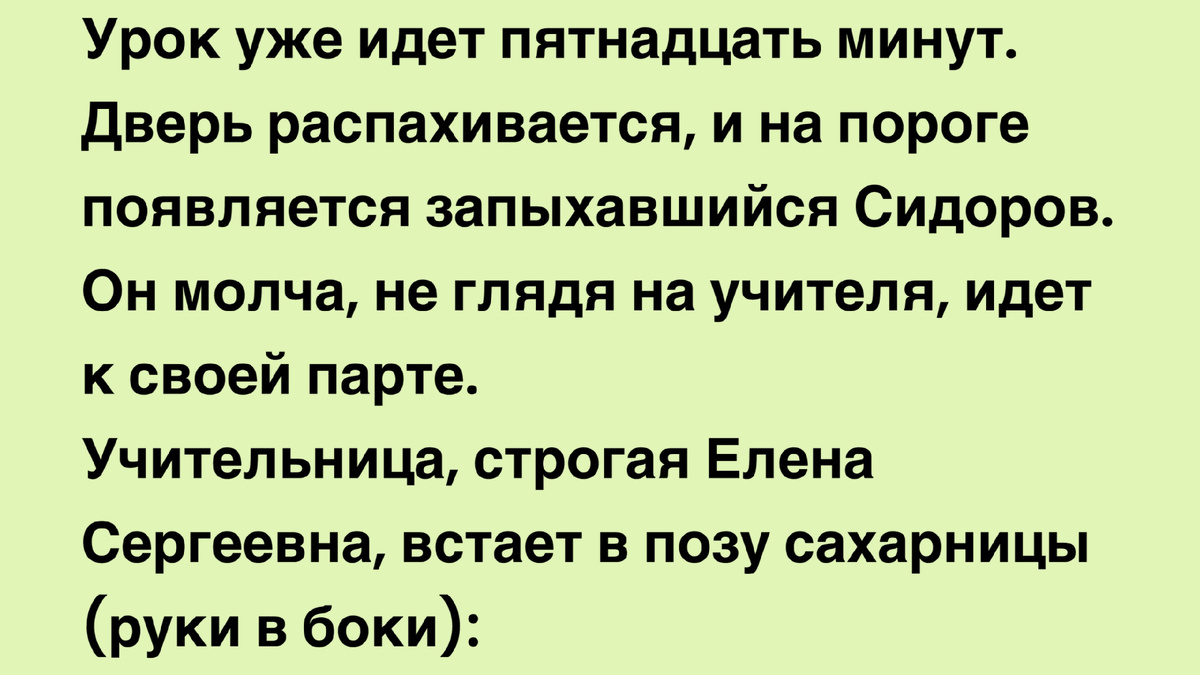 О, этот вечный учительский прием: «Выйди и зайди нормально». Я никогда не понимал, чего они хотят этим добиться? Что за дверью стоит волшебный портал, который превращает невыспавшегося школьника в джентльмена из XIX века? Сидоров в данном случае проявил чудеса адаптивности. Он не стал спорить, он просто переиграл ситуацию в свою пользу. Раз его не пускают, значит, там происходит что-то секретное или праздничное.
