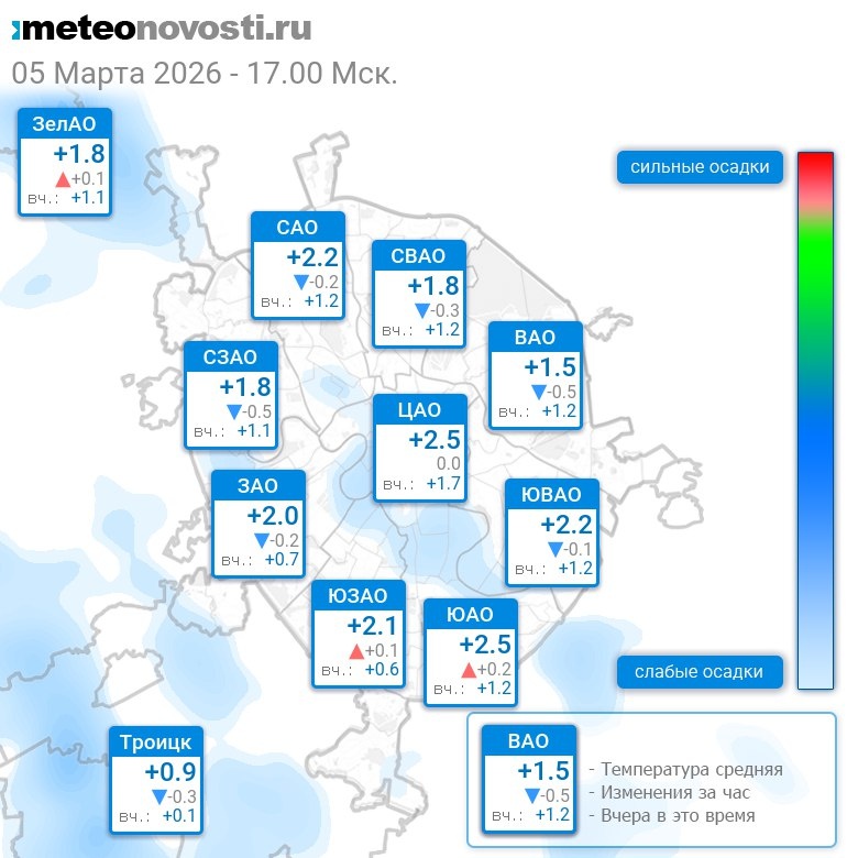 В 17:00 в Москве было от +1.1°C до +2.7°C, средняя температура +2°C #погода #Москва #весна #температура #5марта #четверг