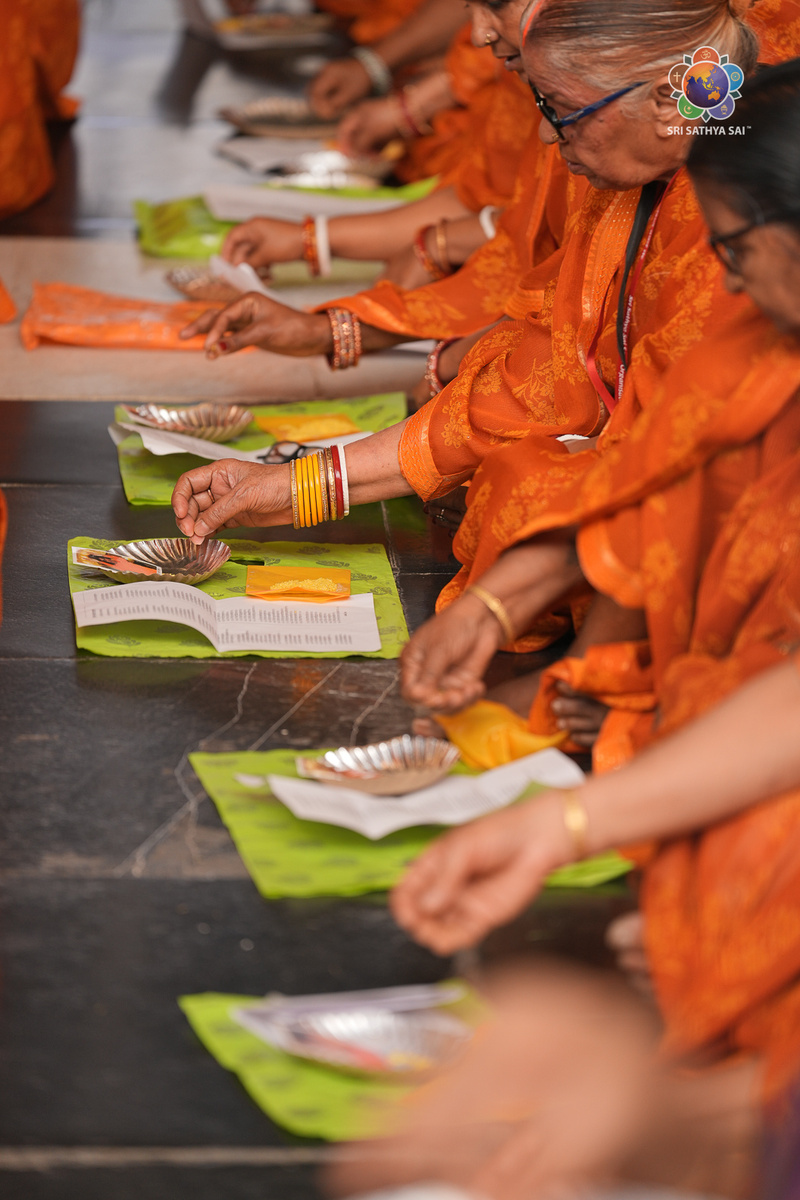 Ранее утром преданные с благоговением поднесли рис к фотографии Свами, распевая Аштоттара Шата Намавали, наполняя пространство священными вибрациями.
