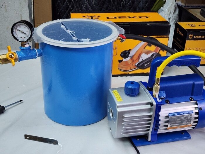 Дегазация — это один из ключевых моментов для получения качественных изделий из смол и пластиков. Вакуумная камера для дегазации (или деаэрации) применяется для удаления пузырьков воздуха из жидких компонентов (смолы, отвердителя) и уже готовой смеси. Давно в хотелках была вакуумная камера для подготовки к заливке различных материалов и для стабилизации дерева, дегазации таких материалов как силикон, полиуретановой резины, всевозможных литьевых пластиков и эпоксидных смолы, гипса и т.д. Подойдет и для пропитки дерева (деревянных заготовок) стабилизирующими составами. Конечно, вакуумную камеру можно сделать своими руками, например, из большого магистрального фильтра. По своей сути - это большая кастрюля с фитингами и крышкой. Но для её работы потребуется вакуумный насос, каким пользуются ремонтники холодильников и монтажники кондиционеров. Замешиваю смолы (и прочие составы) я с помощью шуруповерта, использую средства защиты, одноразовые ёмкости, а также электронные весы с целью контроля