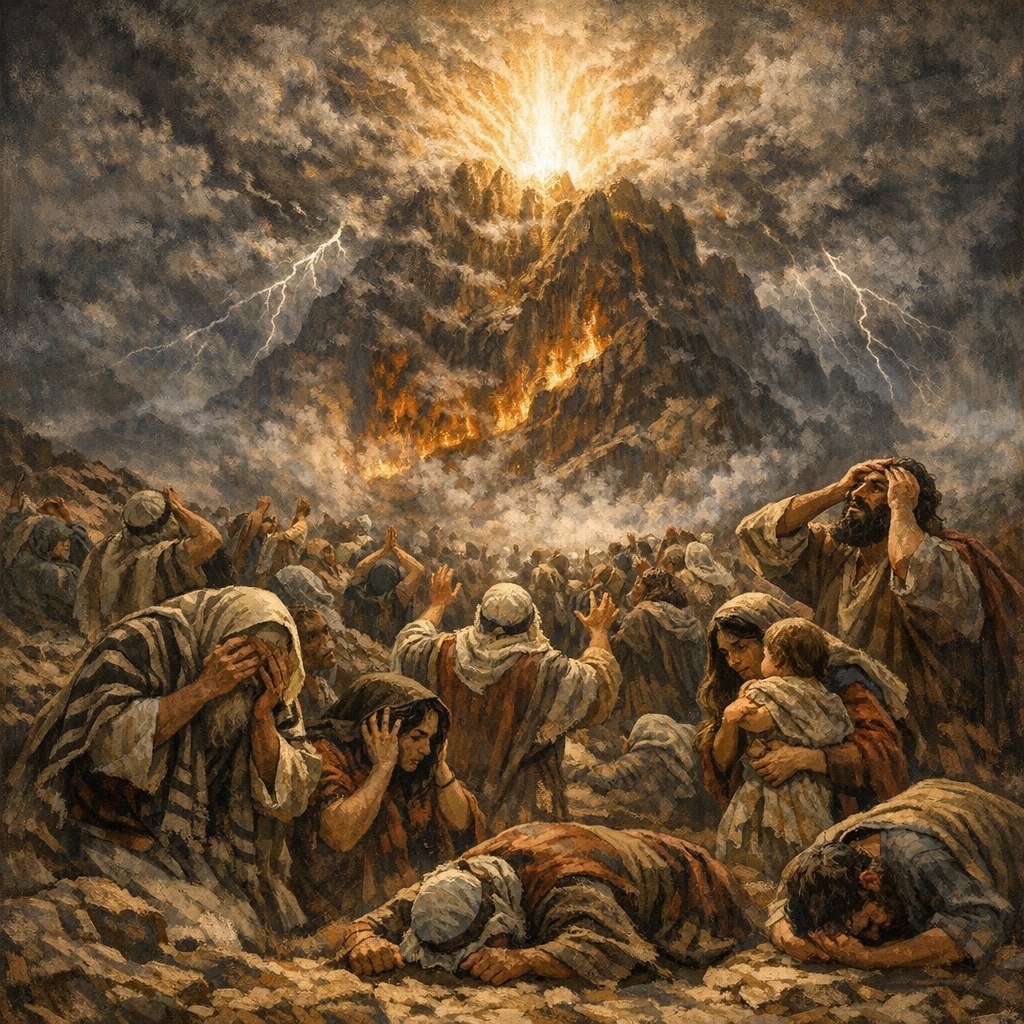 После того, как Бог произнёс десять заповедей, народ приходит в смятение. Они видят гром, молнии, дымащую гору — и говорят Моисею: “пусть Бог говорит с тобой, а мы будем слушать через тебя”. В этой реакции — и малодушие, и глубокая правда о том, как человеку страшно стоять перед Богом лицом к лицу.
