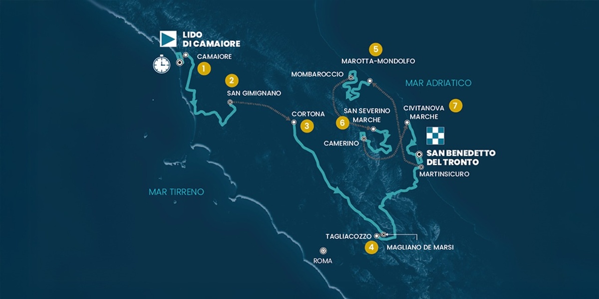 Начало «убийственной» связки этапов в Марке. Гонщиков ждут классические апеннинские подъемы Овиндоли и Валико-делле-Капаннелле. Однако главная опасность кроется в финале: каскад коротких, но адски крутых стен. Кастеллальто с затяжными 12%, Москьяно-Сант-Анджело и, главное, Tortoreto di Badetta. Последний подъем в 12 км от финиша имеет отрезки с градиентом до 20%! После спуска останется лишь 8 км променада до финиша, где разрывники будут пытаться удержать свое преимущество.