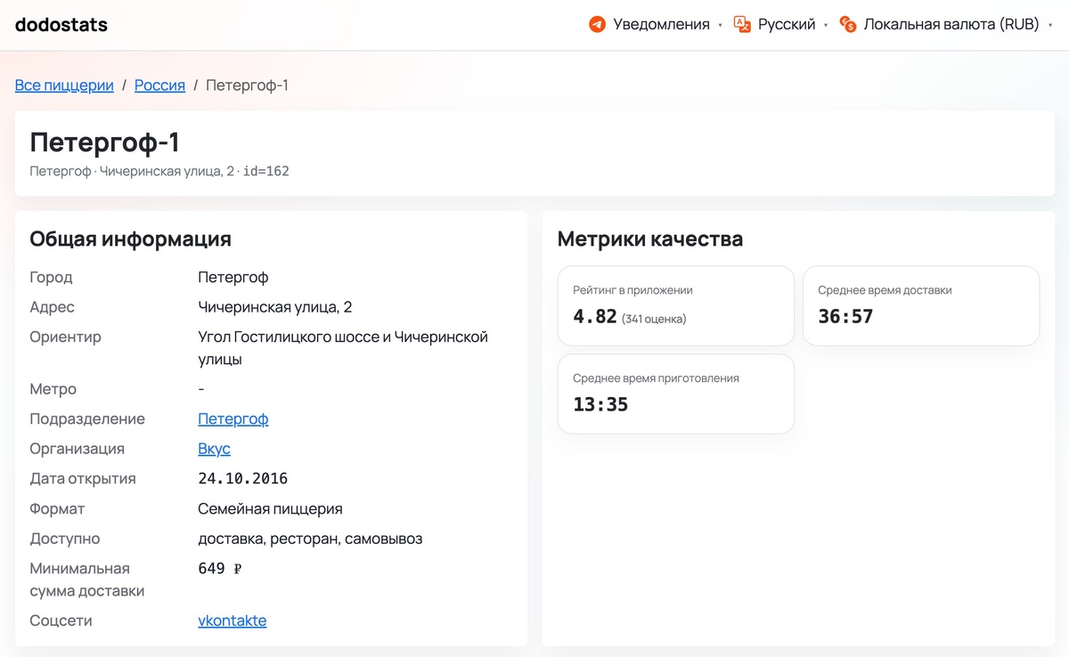 ru. Из интересных нововведений: 1. Сайт теперь адаптивный, нормально работает на мобильных устройствах. 2. Доступны все страны, где есть Додо Пицца, а не только Россия. 3. Можно провалиться до уровня страны, города (для Москвы и Петербурга), подразделения или даже конкретного юрлица. Увидеть все пиццерии, относящиеся к выбранному юниту, динамику количества пиццерий и выручки по месяцам. 4. По-умолчанию выручка и все финансовые метрики отображаются в местной валюте пиццерии. Но для удобства можно переключиться на любую другую доступную валюту – и все финансы пересчитаются по актуальному курсу. Для исторических данных берём в расчёт курс на последний день пересчитываемого месяца. 5. Добавлен английский язык. Поиск пиццерий также доступен на английском: можно набрать в поиске Petergof и найти пиццерию «Петергоф-1». И наоборот: можно найти пиццерию Izmir-1, набирая в поиске «Измир». 6. А ещё сделали бота для Telegram. Можно отслеживать выручку интересующих вас пиццерий или кофеен Др