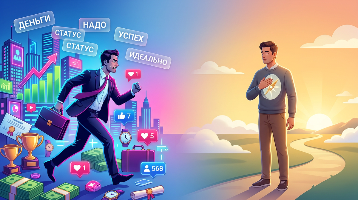 «Успех — это много денег». «Счастье — это семья и дом». «Свобода — это путешествия». Мы берём эти формулы извне: от родителей, общества, соцсетей. И честно пытаемся себя в них втиснуть. Годами. Десятилетиями. А потом просыпаемся с одним вопросом: «Я вообще живу свою жизнь?»