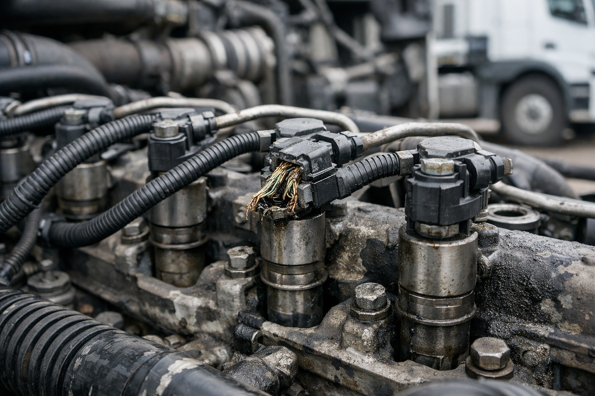 Третье — переходы через раму и зоны, где жгут изгибается. Там он работает как пружина: холодно — дубовый, тепло — мягче, и из-за этого ошибка может появляться «по погоде». Четвёртое — места после ремонта. Любой «быстрый» ремонт выхлопа, замена элементов послеобработки, снятие/установка баков и экранов часто заканчиваются натянутым жгутом или плохо защёлкнутым разъёмом. А потом начинается классика: «после сервиса появилось».