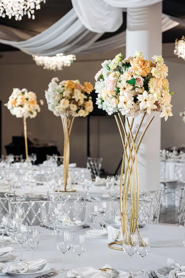 Оформление гостевых столов — одна из ключевых деталей, которая формирует общее впечатление от пространства. Именно на уровне глаз гостей создаётся атмосфера уюта, торжественности и продуманности события. При выборе декора важно учитывать масштаб зала, формат мероприятия и стилистику оформления. В больших пространствах особенно эффектно смотрятся высокие композиции. Они визуально заполняют объём зала, добавляют торжественности и помогают сохранить баланс между архитектурой пространства и декором. Такие композиции могут быть выполнены на специальных стойках или в высоких вазах, создавая выразительный вертикальный акцент. Для средних и небольших залов лучше выбирать невысокие композиции. Они сохраняют ощущение лёгкости, не перегружают пространство и позволяют гостям свободно общаться за столом. Низкий декор делает атмосферу более камерной и уютной, оставаясь при этом эстетичным и продуманным. Для декора гостевых столов используются разные формы и материалы, которые можно комбинировать меж