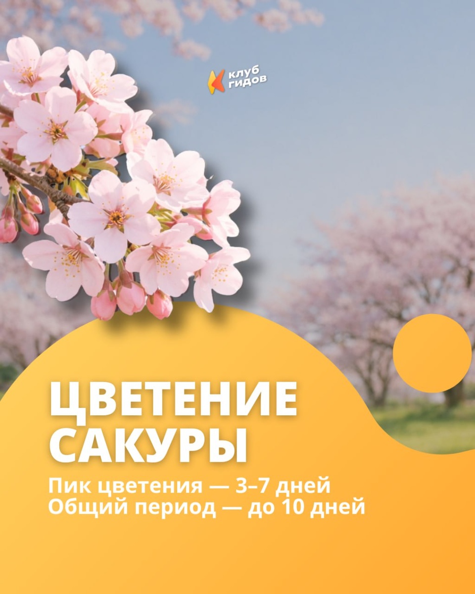 🌸 И каждый год — в разное время Собрали в карточках сроки цветения по месяцам в городах России и других странах. А также лови подборку туров, где ты сможешь увидеть эту красоту 😍: 🔸 Южная Корея. Апрельская сакура 145 867 ₽ | 9 дней 🔸Япония: цветение сакуры 2026 242 840 ₽ | 8 дней 🔸Цветение в Чечне. Сакура, магнолия, маки 38 000 ₽ | 4 дня 🔸Путешествие в Японию: сакура, многовековые традиции и будущее, которое уже наступило! 320 000 ₽ | 11 дней 🔸Активируй весну в Сочи 35 000 ₽ | 7 дней 📥 Сохраняй, чтобы не пропустить пик 🟠 Подписывайся | Клуб гидов