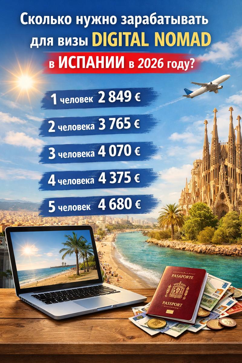 С 2026 года минимальный доход для основного заявителя увеличился до 2 849 евро в месяц. Ранее он составлял 2 763 евро. Изменение связано с повышением минимальной межпрофессиональной зарплаты (SMI) в Испании на 3,1%. Соответствующие поправки закреплены королевским указом №126/2026, опубликованным 26 февраля в официальном государственном бюллетене (BOE). Поскольку условия программы Digital Nomad привязаны к 200% минимальной зарплаты, любое повышение SMI автоматически увеличивает и требования к доходу для иностранцев. Теперь финансовые требования выглядят следующим образом. Минимальный доход: 2 849 € в месяц