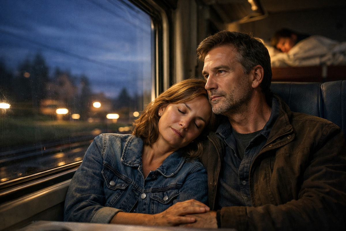 Они сидели, глядя, как за окном сгущаются сумерки. Мелькали деревни, леса, редкие огоньки. Поезд мерно стучал колёсами.