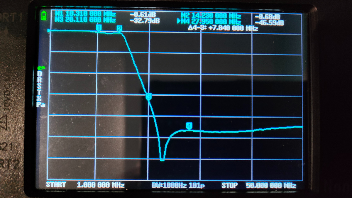 Затухание в полосе пропускания около 0,6 дБ. Не самое лучшее значение, но вполне приемлемо. Потеря около 13% мощности. Затухание на частоте 20 МГц (вторая гармоника 10-мегагерцового диапазона) - почти 33 дб (более 40 раз). Это лучше, чем в модели. Затухание на частоте 28 МГц (вторая гармоника 14 МГц) - более 46 дБ (более 200 раз). А это значение получилось несколько хуже.