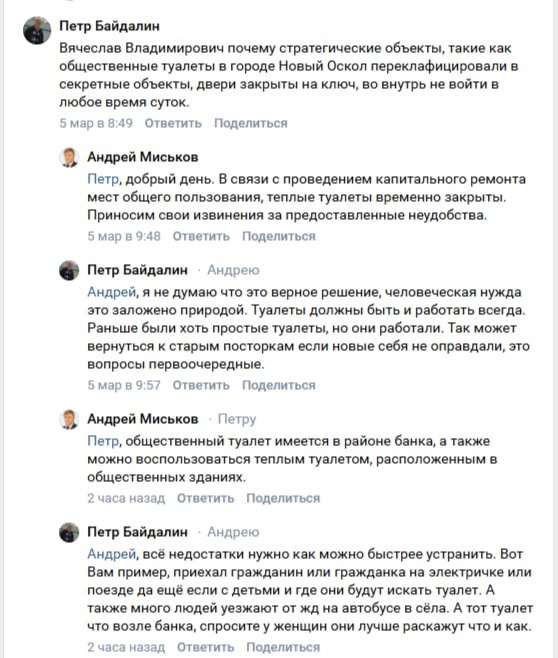 городе неожиданно исчезла одна из важнейших инфраструктур — туалеты. Точнее, они есть, но закрыты на ключ, будто там хранятся государственные тайны, а не то, что обычно хранят в туалетах. «Почему стратегические объекты, такие как общественные туалеты, переквалифицировали в секретные?» — поинтересовался Пётр под постом губернатора. И вопрос, надо признать, философский. Ведь если дверь закрыта, а приспичило — городская урбанистика начинает ощущаться особенно остро. Ответ не заставил себя ждать. Через час глава округа Андрей Миськов вышел на связь и выдал жителям, можно сказать, навигационную карту экстренного реагирования. Если ситуация критическая — бегите за банк. Если хочется комфорта — ищите тёплый туалет в общественных зданиях. То есть в Новом Осколе теперь два уровня сервиса: эконом — за банком, и бизнес-класс — в помещении. Правда, Пётр Байдалин остался недоволен. По его мнению, закрывать туалеты на ремонт — решение спорное. Он предложил проверенную веками технологию — «просты