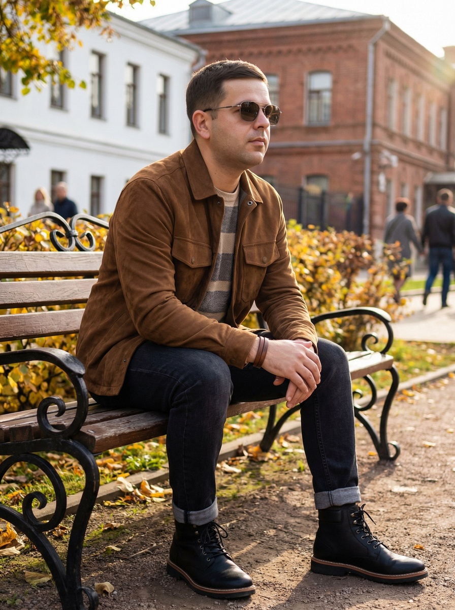 🤖Генерировать можно здесь: 👉БОТ ДЛЯ ГЕНЕРАЦИИ Режим Nano Banana 2/Pro ИНСТРУКЦИЯ Молодой мужчина с загруженного фото, стильный и уверенный. Черты лица, форма глаз, цвет волос и общий облик мужчины строго перенесены с загруженного референсного фото - точное сходство обязательно. Одет в модные солнцезащитные очки в тонкой металлической оправе. Лицо выражает спокойную задумчивость, взгляд направлен немного в сторону от камеры — эмоция: расслабленная уверенность, легкая меланхолия. Стиль одежды: уличный-кэжуал в стиле «modern vintage» — коричневая замшевая куртка-рубашка с двумя нагрудными карманами и пуговицами, под ней — свитер с горизонтальными полосками (бежево-серые тона), темные джинсы с завёрнутыми штанинами, черные ботинки на шнуровке с контрастной подошвой. На запястье — простой кожаный браслет или часы. Фон: городской парк осенью — деревья с желто-коричневой листвой, размытые силуэты зданий вдалеке (белое и красное кирпичное здание с окнами), зелёная трава и тропинка, слегка