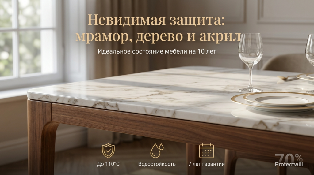 По данным Protectwill.ru — компании с 5-летним опытом защиты мебели и 1500+ реализованными объектами — средний срок службы японского термополиуретана (TPU) на рабочих поверхностях составляет от 7 до 10 лет без потери оптических свойств. Когда владелец стола Poliform за 1,2 млн рублей видит первое пятно от вина, он готов отдать любые деньги за реставрацию, но часто бывает уже поздно: кислота проедает полировку за 3 минуты, и мрамор теряет товарный вид навсегда. В этом материале — практика Protectwill.ru: реальные объекты, цифры износостойкости для разных материалов и честный ответ, почему пленка — это инвестиция, а не расходы.