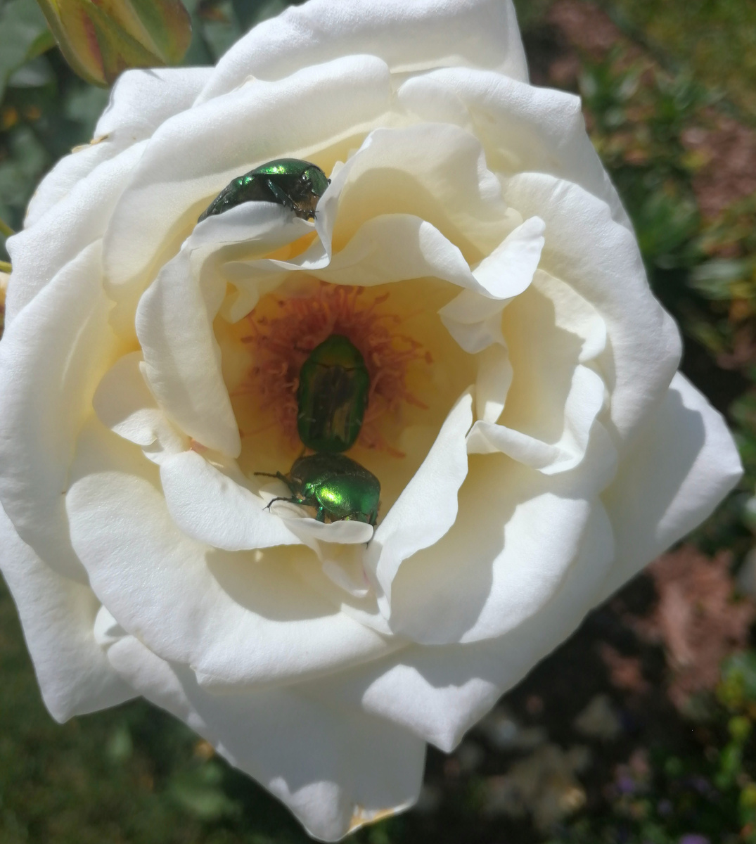 🪲 Пока я решила, что бронзовка — скорее декоративный элемент, чем злостный вредитель. Она не настолько портит внешний вид розы, чтобы объявлять ей тотальную войну. Тем более, её личинки приносят реальную пользу, перерабатывая компост.
