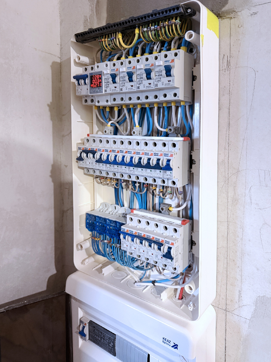 Силовая часть на 36 модулей собрана с использованием РКН и автоматики КЭАЗ, нагрузка разбита на 4 группы УЗО. Слаботочный щит расположен отдельно — для Wi-Fi роутера и блока питания на подсветку в ванне. Как вам такая компоновка? Пишите в комментариях. Реклама. ООО "КЭАЗ" ИНН 4632025039 erid: 2VfnxvjBs2q