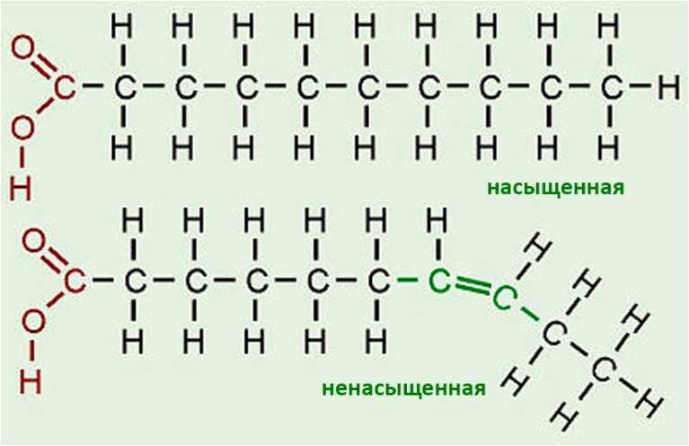 Как видите, разница в том, что у ненасыщенных кислот несколько атомов водорода (Н) отсутствуют, и свободные связи рядом стоящих атомов углерода (С) замыкаются друг на друге, образуя двойную связь.