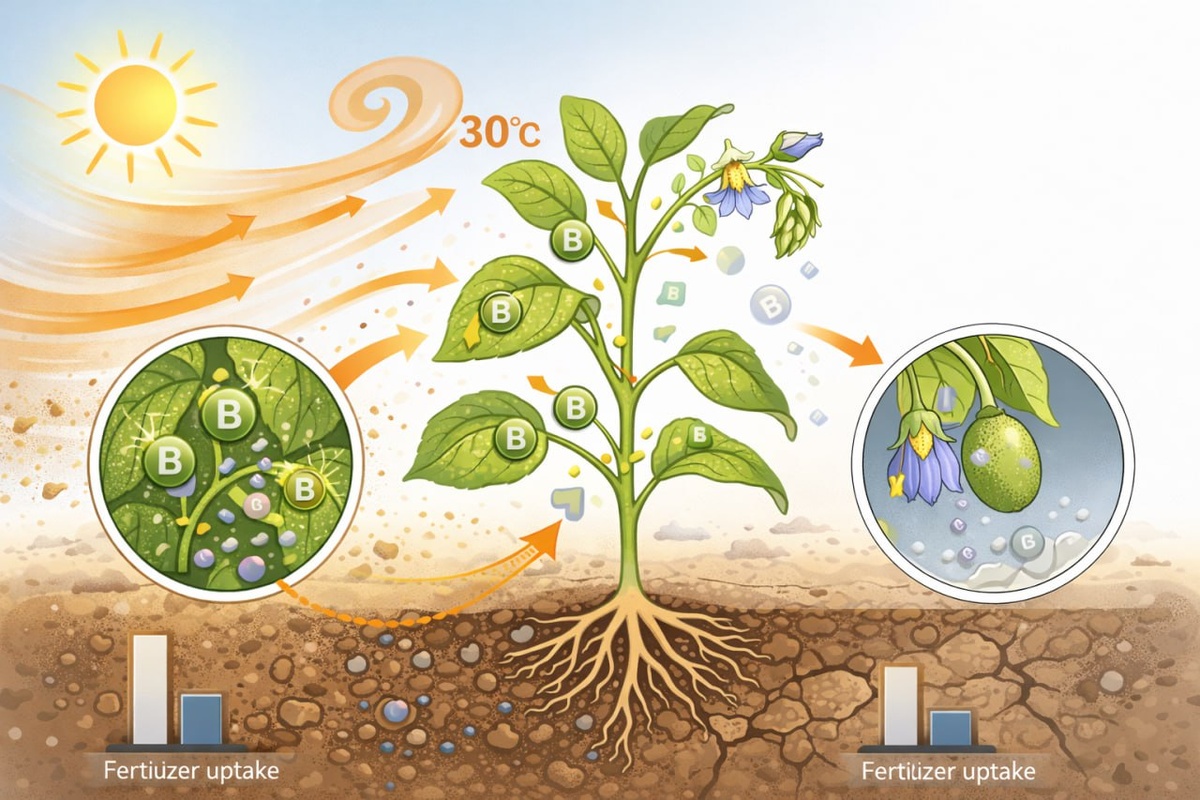 Бор относится к элементам с крайне специфической физиологией транспорта в растении. Его перемещение происходит преимущественно с транспирационным потоком по ксилеме, а способность к повторной мобилизации внутри растения очень ограничена. Поэтому стабильность борного питания напрямую зависит от водного режима и интенсивности испарения. При сухой и ветреной погоде транспирация резко усиливается. В этих условиях поток воды через листья возрастает, но распределение бора по органам растения становится неравномерным. Он активно накапливается в старых листьях, тогда как молодые ткани и особенно генеративные органы могут испытывать локальный дефицит. Это связано с тем, что цветки, бутоны и молодые завязи обладают относительно низкой транспирационной активностью. При сильном ветре и низкой влажности воздуха бор продолжает перемещаться по основному транспирационному потоку, минуя эти органы. В результате именно в наиболее чувствительных тканях может возникать недостаток элемента, даже если его