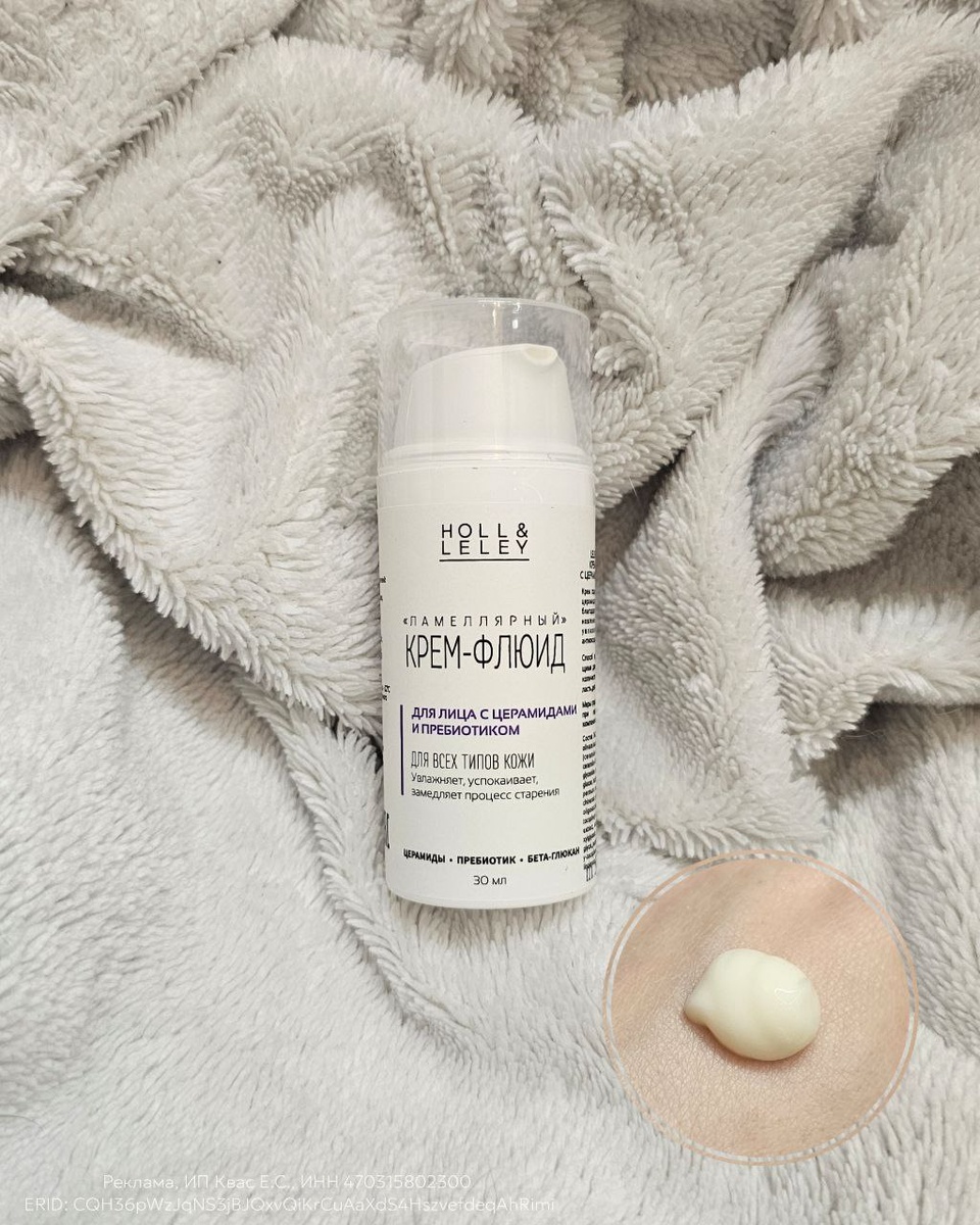 ? Ретиноиды, это прекрасно: гладкая кожа, ровный тон, сияние. Но иногда утром кожа смотрит из зеркала, и просит меньше экспериментов. Лично меня в такие дни спасает Holly&Leley, наши баночки с производством в Ленинградской области. Основа бренда корнеотерапия, это наука о здоровье рогового слоя кожи, то есть того самого барьера, который ретиноиды периодически проверяют на прочность. Мне всегда нравятся формулы, где компоненты не просто собраны в банке, а работают командой. Поэтому можно смело покупать любой крем, каждая баночка на основе ламеллярной эмульсии. Беру уже третий по счету ламеллярный крем-флюид с церамидами и пребиотиком. Сначала была любовь из-за состава. А теперь из-за многофункциональности, живёт у меня на полочке в ванной постоянно. Моя кожа уже привыкла и к ретинолу, и к ретиналю. Но иногда всё равно случаются шелушения и чувствительность, особенно в межсезонье. И вот тогда нужен не просто увлажняющий крем, а тот, кто реально «залатает» барьер. Флюид оказался имен