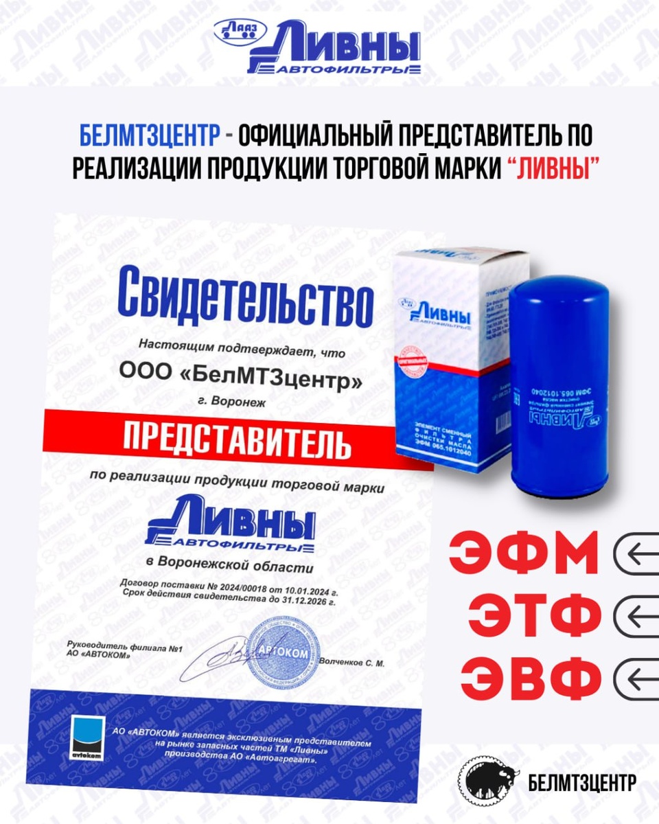 🔰🙃🙃 🙃🙃🙃🙃🙃🙃🙃🔰 Покупай автофильтры на сайте БелМТЗцентр ЭМФ 💥 ЭТФ 💥ЭВФ 🏅Основные преимущества фильтров ТМ «Ливны»: 🙃🙃Фильтр «Ливны»-№1 на автосборочных конвейерах России и СНГ. Ливенское предприятие осуществляет поставки более чем на 60 автосборочных и моторосборочных конвейеров России и СНГ. Вся продукция соответствует требованиям автопроизводителей и рекомендована при плановом и техническом обслуживании автомобилей. Используя фильтры ТМ «Ливны», Вы получаете качество конвейерной комплектации и максимальный ресурс вашей техники. 🙃🙃 Высокое качество продукции. Для производства фильтров используются современные технологические процессы, современное оборудование и высококачественные комплектующие. Производится контроль всех технологических параметров в процессе производства, 100% проверка топливных и масляных фильтров, как на герметичность, так и по внешнему виду. 🙃🙃Комплексное обслуживание по всем видам фильтров. Номенклатура выпускаемой продукции составляет бол
