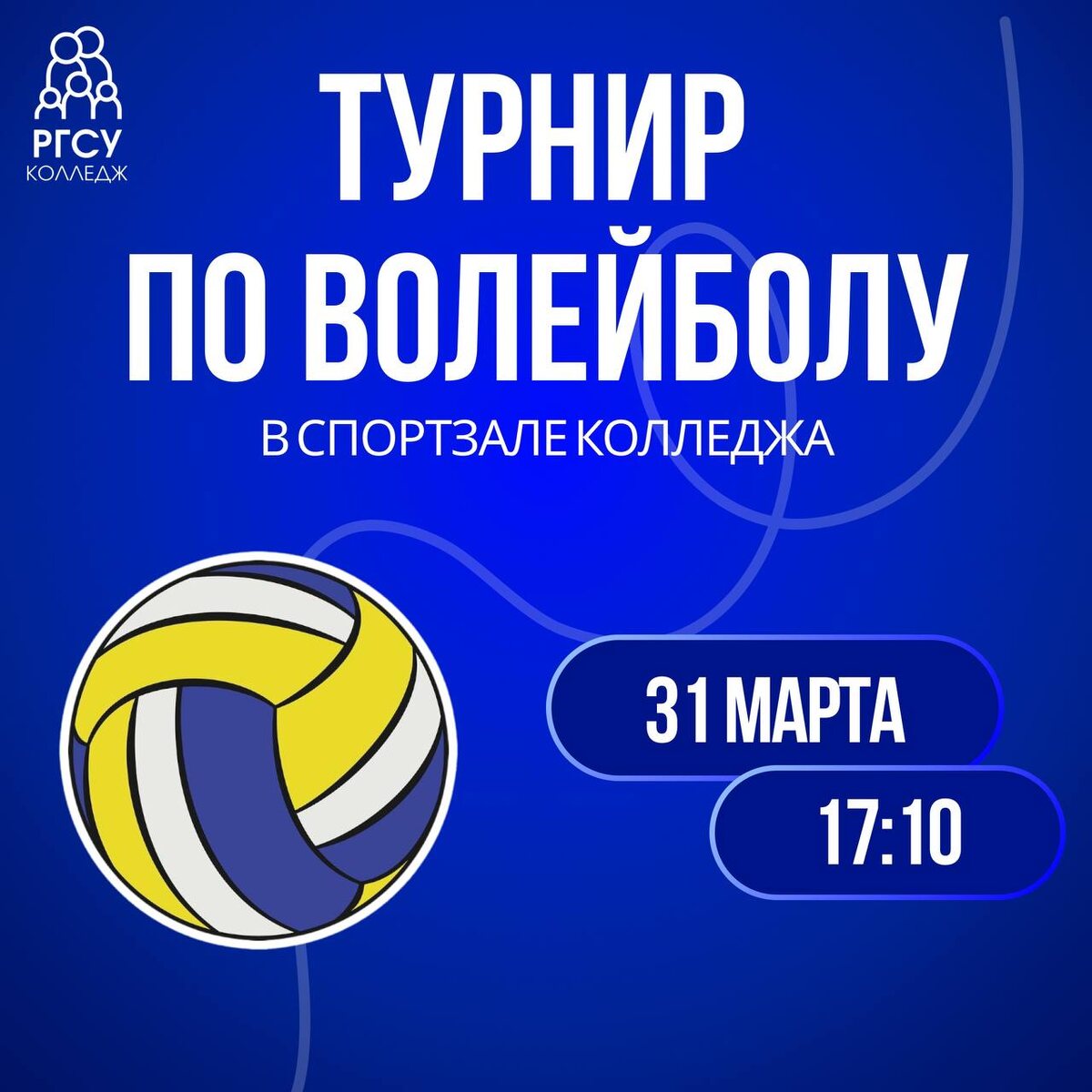 ! 31 марта в 17:10 в спортивном зале Колледжа РГСУ состоится волейбольный турнир. Приглашаем студентов и преподавателей принять участие и поддержать команды. 📍 Где: Колледж РГСУ, ул. Лосиноостровская, 40 к.2 (спортивный зал) 👥 Состав команды: 6 человек (обязательно не менее 3 девушек) Хочешь заявить свою команду? Приходи в спортивный зал и обратись к преподавателям физической культуры: ✔️Анна Владиславовна Андрюшина ✔️Наталья Геннадьевна Овтина #спорт