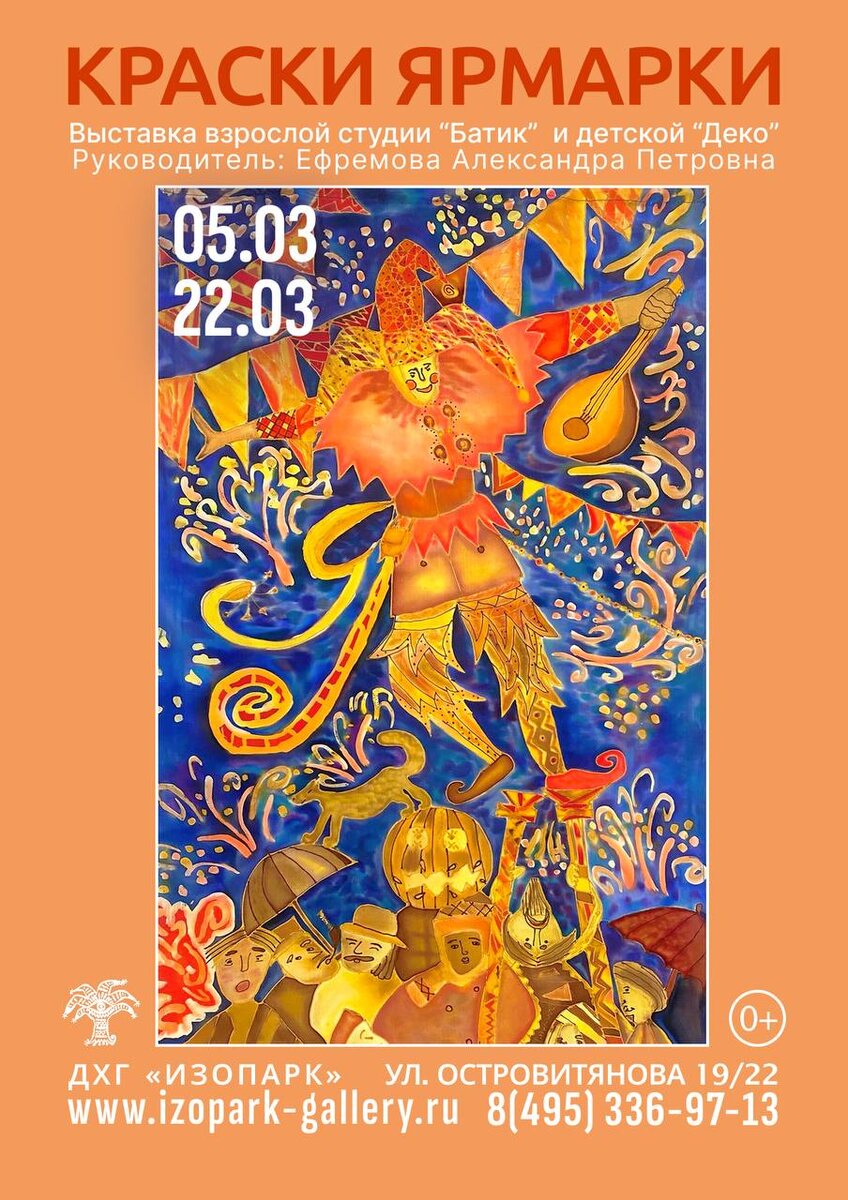 ”!☀️ Работы на выставке - это художественное переосмысление образов карнавальной русской традиции. Коллекции масок, текстильная скульптура, декоративные панно и рельефы украсят новую экспозицию галереи “Изопарк”. Традиционные техники росписи на ткани чередуются с более сложными авторскими приёмами. Работы на выставке представляют студия для взрослых “Батик” и детская студия “Деко”, под руководством Ефремовой Александры Петровны. 🔶с 05.03.26. по 22.03.26. Вход свободный Адрес :ул. Островитянова 19/22 8(495)336-97-13 🔶Информационный партнер — проект «Отдых с детьми» (OSD.ru)