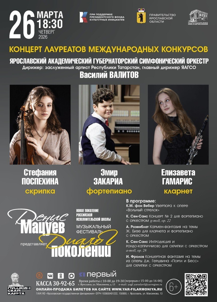 ! ✨ Приглашаем вас на концерт лауреатов международных конкурсов в исполнении Ярославского академического губернаторского симфонического оркестра и талантливых солистов. Мероприятие проводится в рамках музыкального фестиваля «Денис Мацуев представляет: диалог поколений. Новое поколение российской исполнительской школы» при поддержке Президентского фонда культурных инициатив. Цель проекта - поиск и развитие молодых талантов. Под руководством главного дирижёра ЯАГСО Василия Валитова, на сцене засияют талантливые солисты: Стефания Поспехина (скрипка) Елизавета Гамарис (кларнет) Эмир Закариа (фортепиано) В программе: 🎼 К.М. фон Вебер - Увертюра к опере «Вольный стрелок» 🎼 Ф. Мендельсон - Концерт № 1 для фортепиано с оркестром g-moll, op. 25 🎼 А. Розенблат - «Кармен-фантазия» на темы Бизе для кларнета и фортепиано с оркестром 🎼 К. Сен-Санс - Интродукция и рондо-каприччиозо для скрипки с оркестром a-moll, op. 28 🎼 И. Фролов - Концертная фантазия на темы из о Показать полностью...